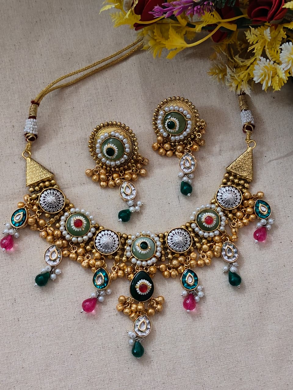 Crafted from high-quality brass and finished in a rich antique gold tone, the choker features finely detailed motifs accented with vibrant stones and delicate bead embellishments. The compact design offers a perfect blend of heritage charm and modern sophistication, making it ideal for weddings, festive occasions, and special celebrations.