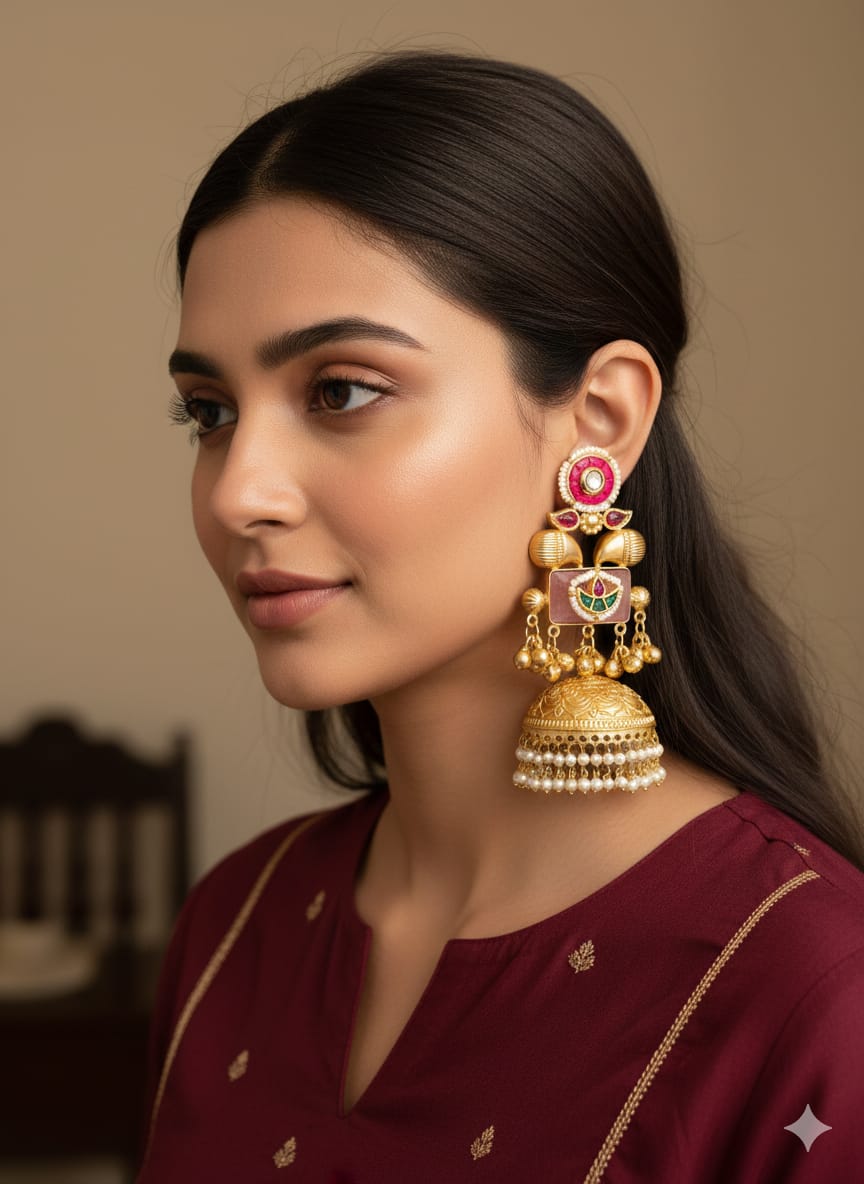 Add a touch of timeless charm to your jewelry collection with these exquisite gold-toned brass jhumka earrings. Crafted with precision, these earrings feature a classic dome design that beautifully reflects traditional artistry. The rich gold finish enhances their regal appeal, making them perfect for festive occasions, weddings, or ethnic celebrations. Lightweight yet durable, they ensure all-day comfort while elevating your overall look with effortless grace.